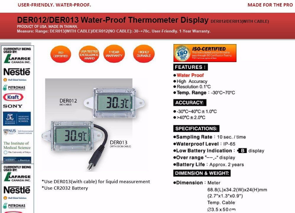 DER013 Water-Proof Thermometer Display (with 50cm temp cable)